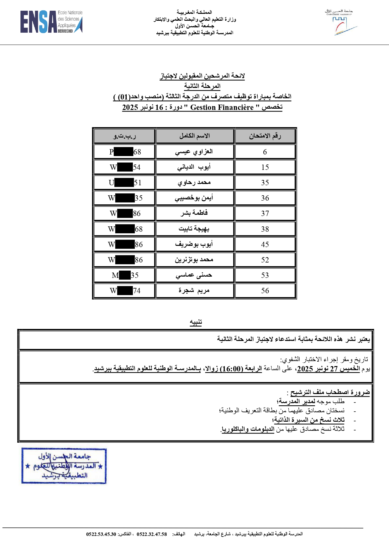 إعلان لائحة المدعوين للاختبار الشفوي الخاصة بمباراة توظيف متصرف من الدرجة الثالثة (منصب واحد (01)) تخصص " Gestion Financière " دورة : 16 نونبر